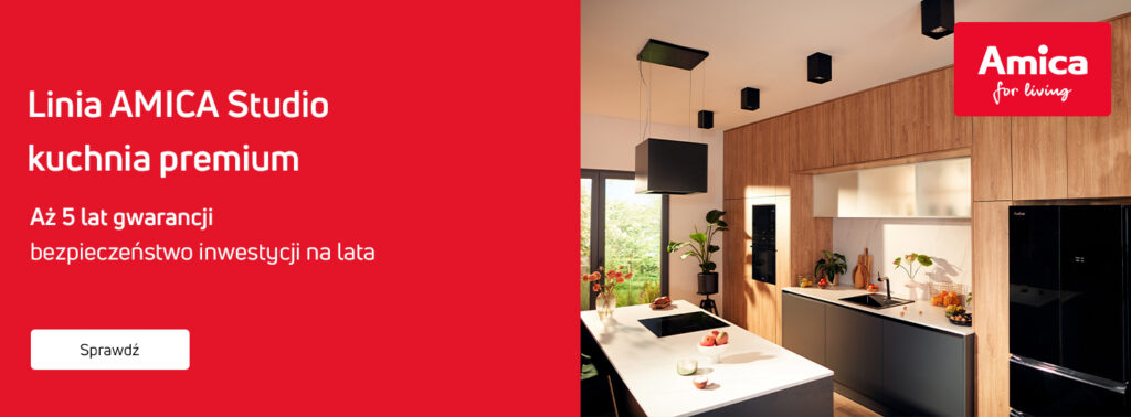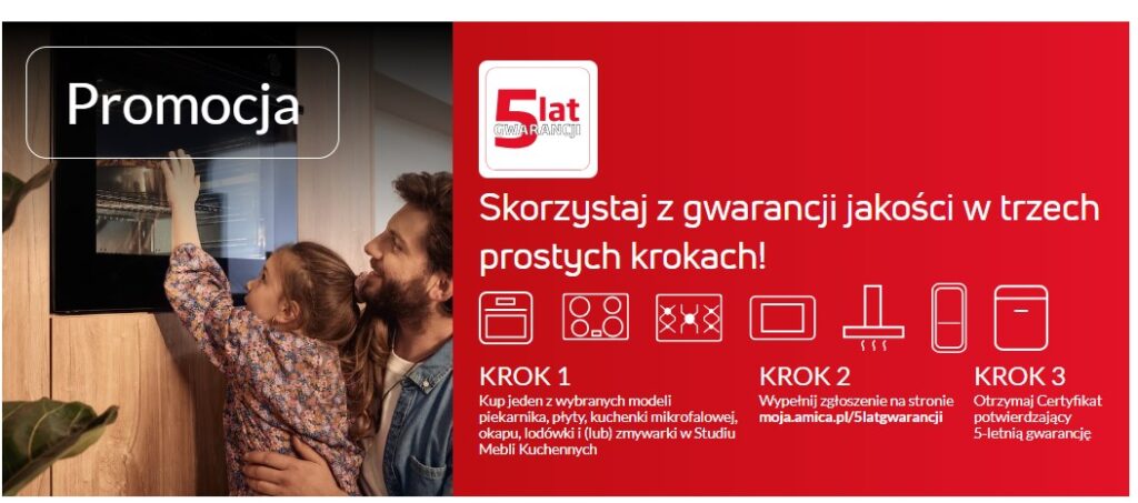 Wybierając wybrane modele sprzętów Amica Studio – piekarniki, płyty grzewcze, kuchenki mikrofalowe, okapy, lodówki oraz zmywarki – i kupując je w Studiu Mebli Kuchennych Artful, zyskujesz aż 5 lat gwarancji producenta.